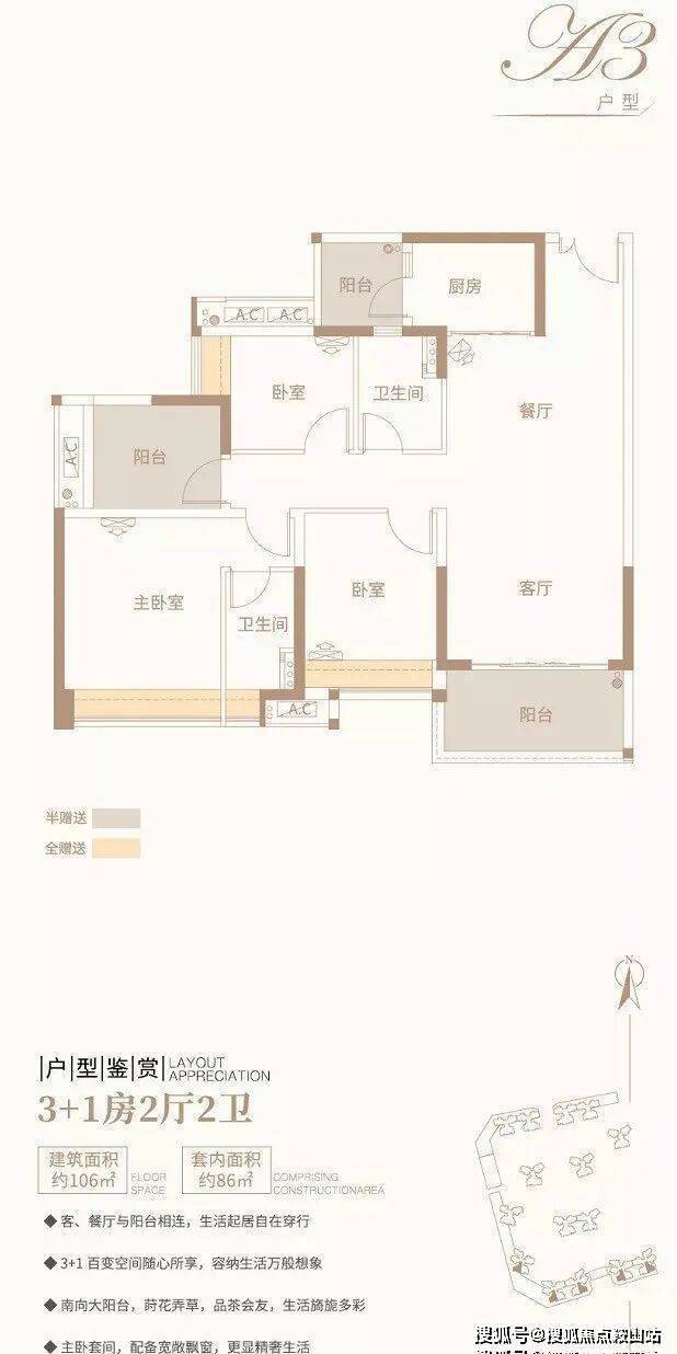 ③ 3+1房2厅2卫/约106平方米/南向阳台,宽敞客厅