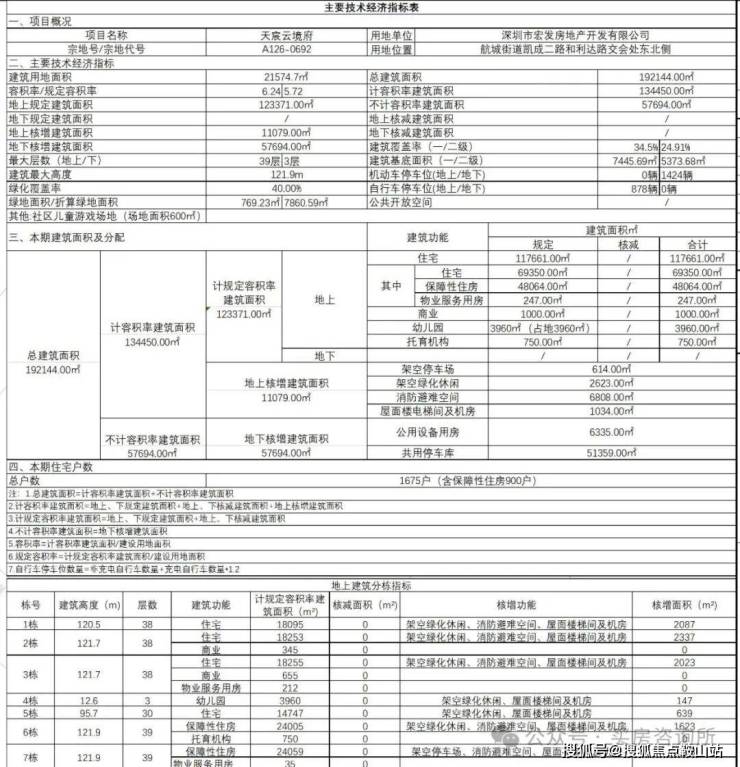 项目规划由6栋住宅及1栋幼儿园组成,总户数为1675户,其中1、2、3、5栋为总高30-38层高纯商品房住宅,共775户,4栋为3层高幼儿园,6、7栋为39层的保障性住房,共900户。