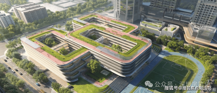 项目配建投资超8亿的红岭教育集团红树林校区。九年一贯制72班(小学48班+初中24班)公立学校,由全球TOP10设计事务所AEDAS设计。