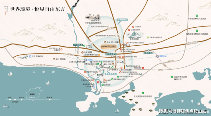 三、出则繁华、入则宁静的伴山舒居生活保利·伴山瑧悦紧邻主城荔枝沟、迎宾路、火车站等繁华商圈,项目北向为城市主干道落笔洞路,可轻松通达三亚全城;紧邻高速路口、高铁站,可速达机场。出则尽享城市便利交通及繁华配套、入则奢享人文山境风光,闹中取静,离尘不离城的度假胜境。