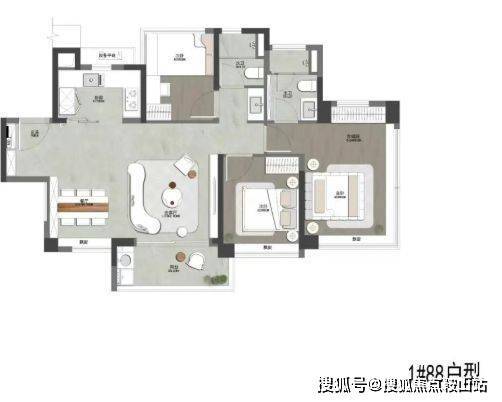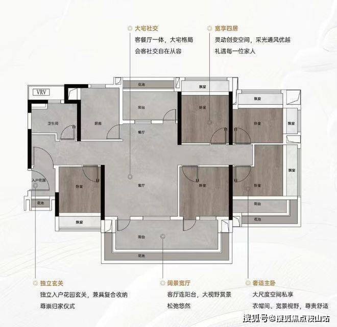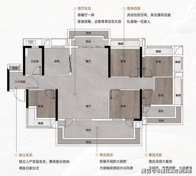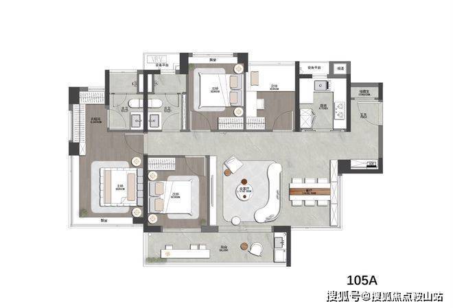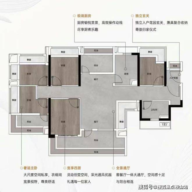 约105㎡真四房:四开间朝南,南向面宽达12.8米,主卧配备独立衣帽间与270°环幕飘窗,尺度感媲美改善大宅;