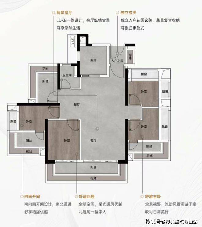 约102㎡四房:采用LDKB一体化设计,会客空间开阔,南向面宽充足,搭配高赠送花池与飘窗,实用与颜值兼备;