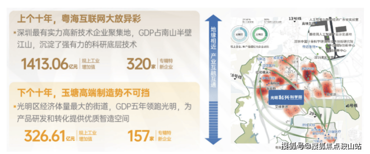产研结合奠定了粤海街道的成功,玉塘现已汇聚168个科研实验室,20余支院士团队,科研院所人才4400人。通过深圳最强科创中轴线的链接,将加速两地产业、人才的互联互通