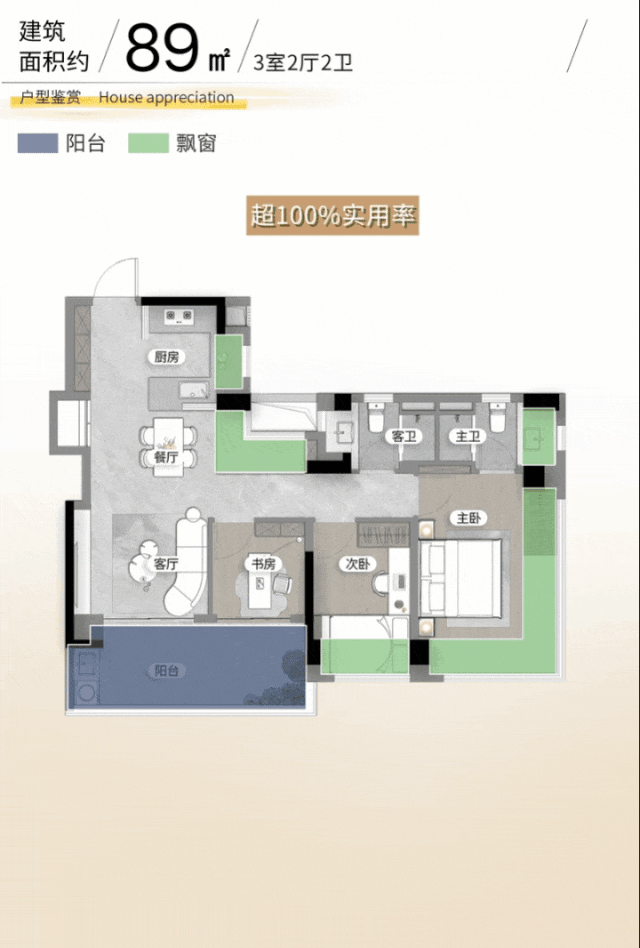 约89㎡却做到了市面罕见的四面宽朝南,约5.7米宽阳台连通客厅与书房,主卧270°环幕视野,极致采光与开阔视野令人赞叹,即使是入门级,也绝不将就。