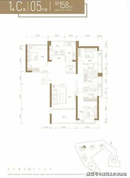 约158㎡四房两卫(1栋C座05户型)竖厅格局,餐客一体化,客厅开间约4.4米,主卧开间约3.7米,卫生间干湿分离设计,东南朝向。