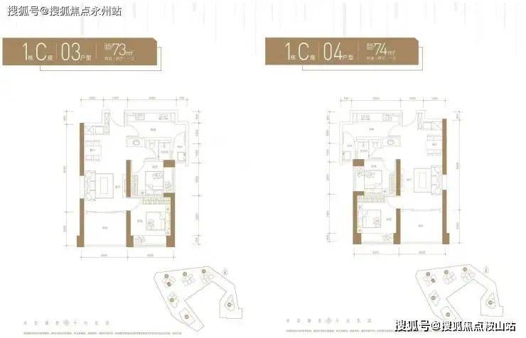 约73㎡两厅一卫(1栋C座03户型)竖厅格局,餐客一体化,客厅开间约3.25米,主卧开间约3.2米,次卧开间约2.3米,厨房带生活阳台,东南朝向。