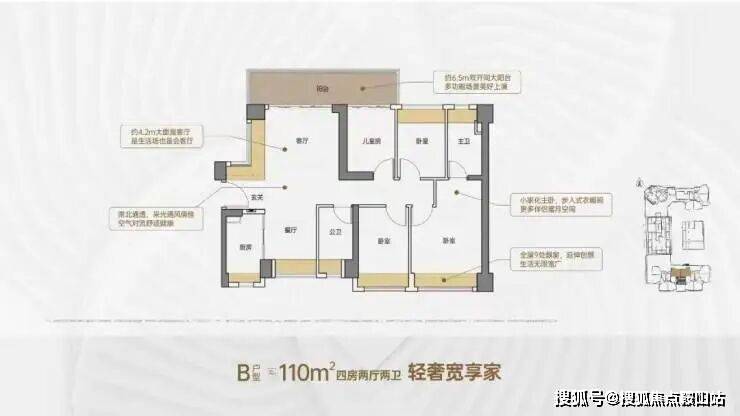 110㎡的4房2厅2卫,设计的是竖厅南北通透格局,客厅4.2米开间,进门户玄关,客厅连接次卧出6.5米长的大阳台,主卧大套间设计,全屋9处飘窗,U型厨房,卫生间干湿分离,阳台主朝北向。