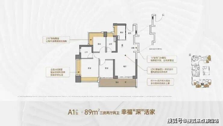 89㎡的3房2厅2卫,A2户型,设计的是竖厅格局,客厅3.5米开间,LDKB一体化,S墙设计预留冰箱卡槽位,客厅连接次卧出5.9米长的大阳台,次卧270度转角飘窗,U型厨房,卫生间干湿分离,阳台有朝西向、东向、南向。
