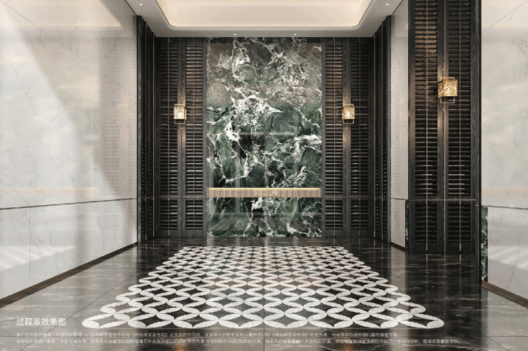 小区内部使用大量普拉达绿岩板饰面,其有着碧浪破碎般的优雅肌理,带着浓厚的宝格丽风情。这样浪漫大胆的用料,公区几乎随处可见。