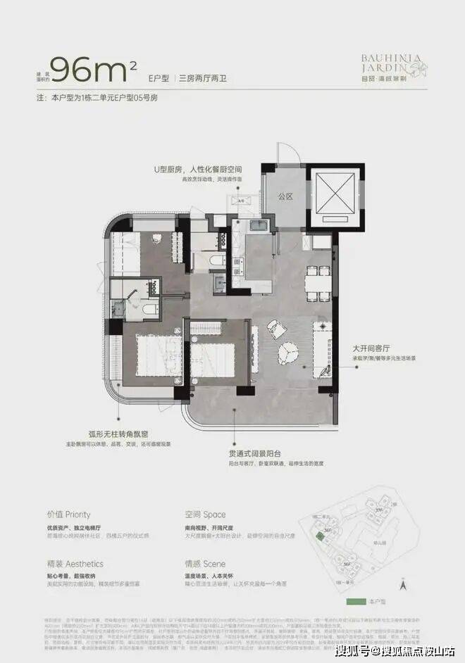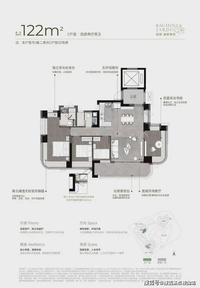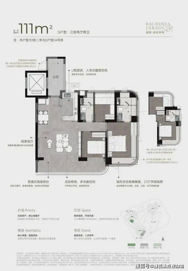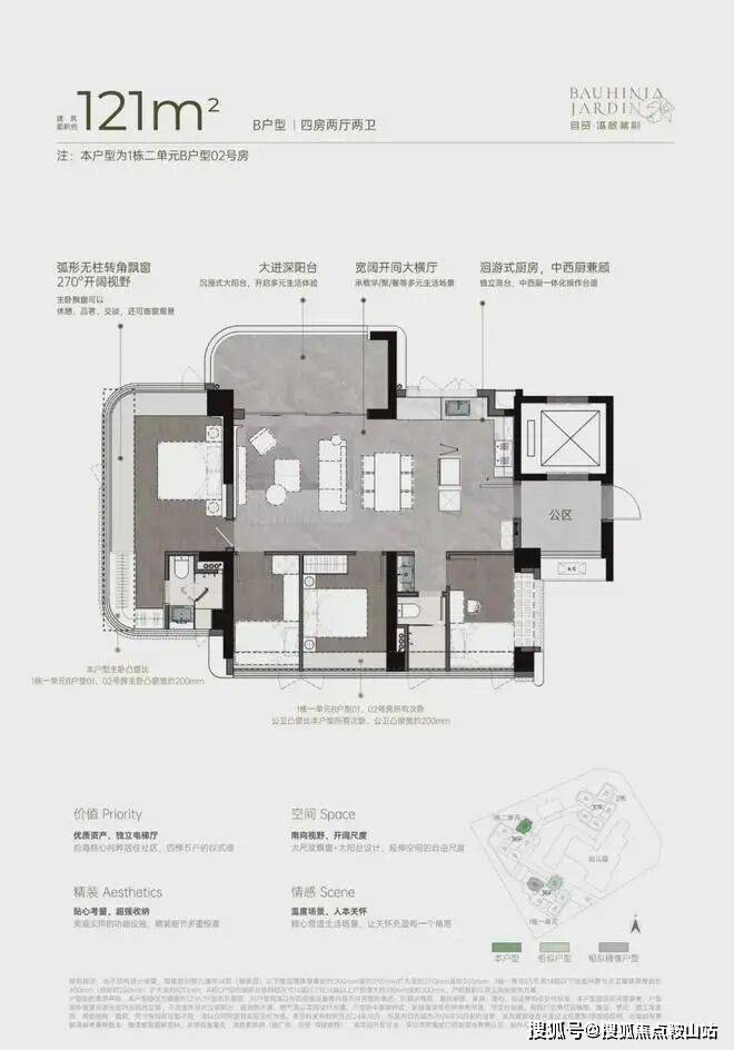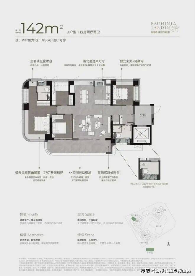 灵动空间格局,因更高的获得感而松弛• 四梯五户,独立电梯厅;• 户户均有南向视野,空间格局通透敞亮;• 270°弧形无柱大尺度飘窗、大宽厅、大阳台,带来更多使用空间。