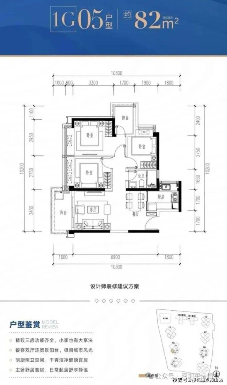 1G-05户型:约82㎡ 三房两厅两卫: