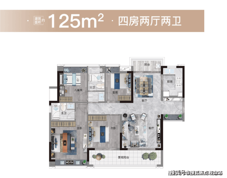 125㎡四房户型分为竖厅、横厅两种,且与其他四房单位均为单边位设计,拥有景观大阳台,对流采光条件优越。