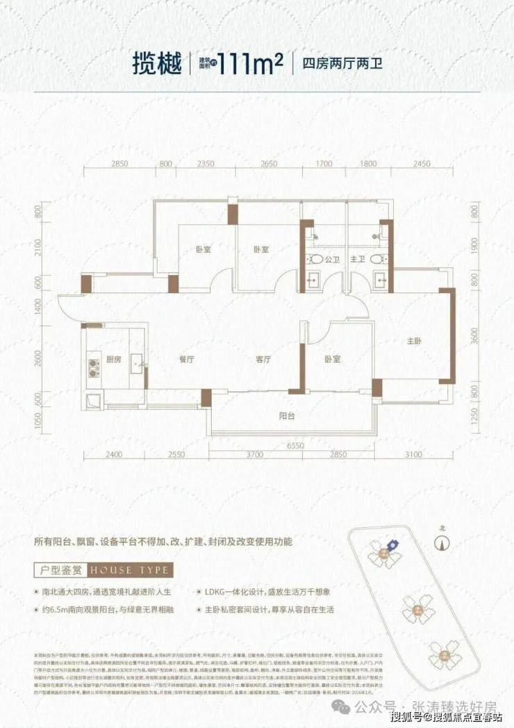 111㎡的4房2厅2卫,设计的是横厅南北通透格局,独门独户,进门入户玄关,客餐厅6.2米开间,LDKB一体化,全屋10面飘窗,主卧南北通,客厅连接次卧出6.8米长的大阳台,U型厨房,卫生间干湿分离,得房率约95.73%(包含赠送),阳台主朝东南向。