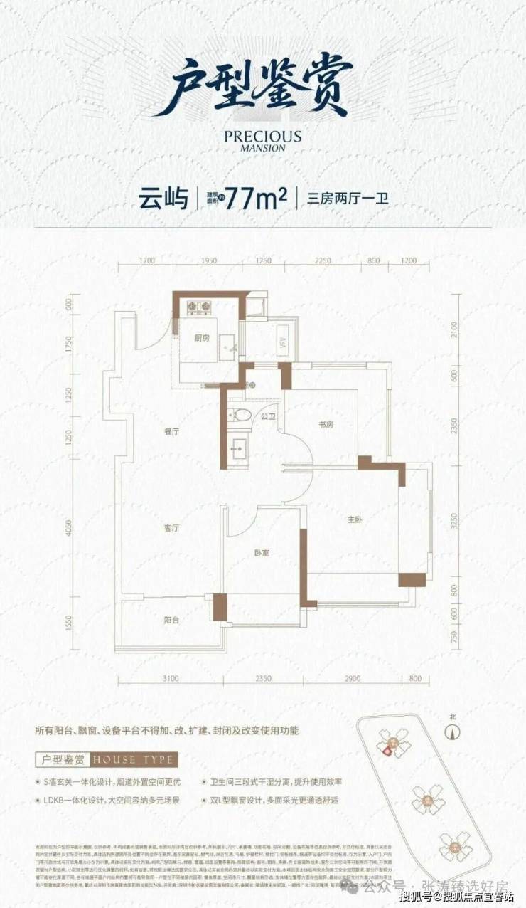 77㎡-3房2厅1卫,设计的是经典竖厅格局,客厅3.3开间,LDKB一体化,S墙设计预留冰箱卡槽位,动静分区,三开间朝南,U型厨房,卫生间三段式分离,还带1个设备平台,得房率约88.34%(包含赠送),西南朝向。