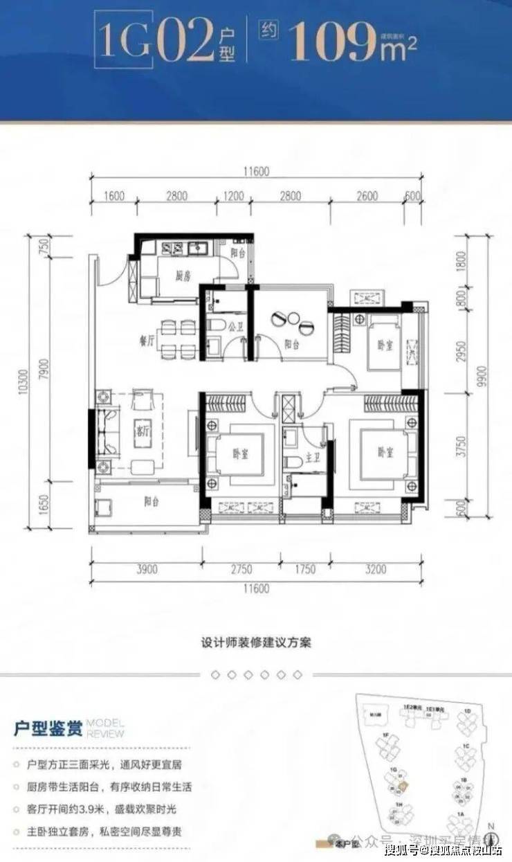 1G-02户型:约109㎡ 四房两厅两卫: