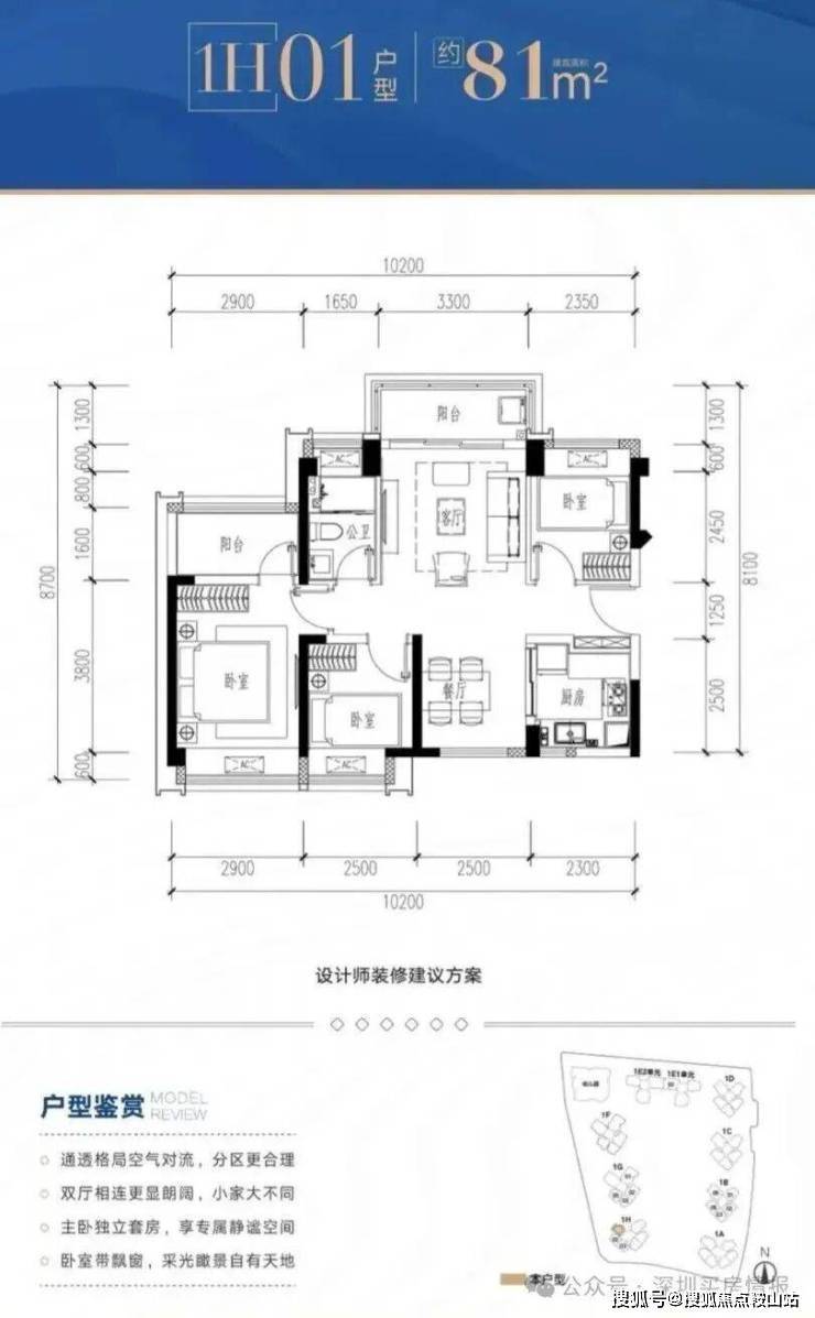 1H-01户型:约81㎡ 三房两厅两卫: