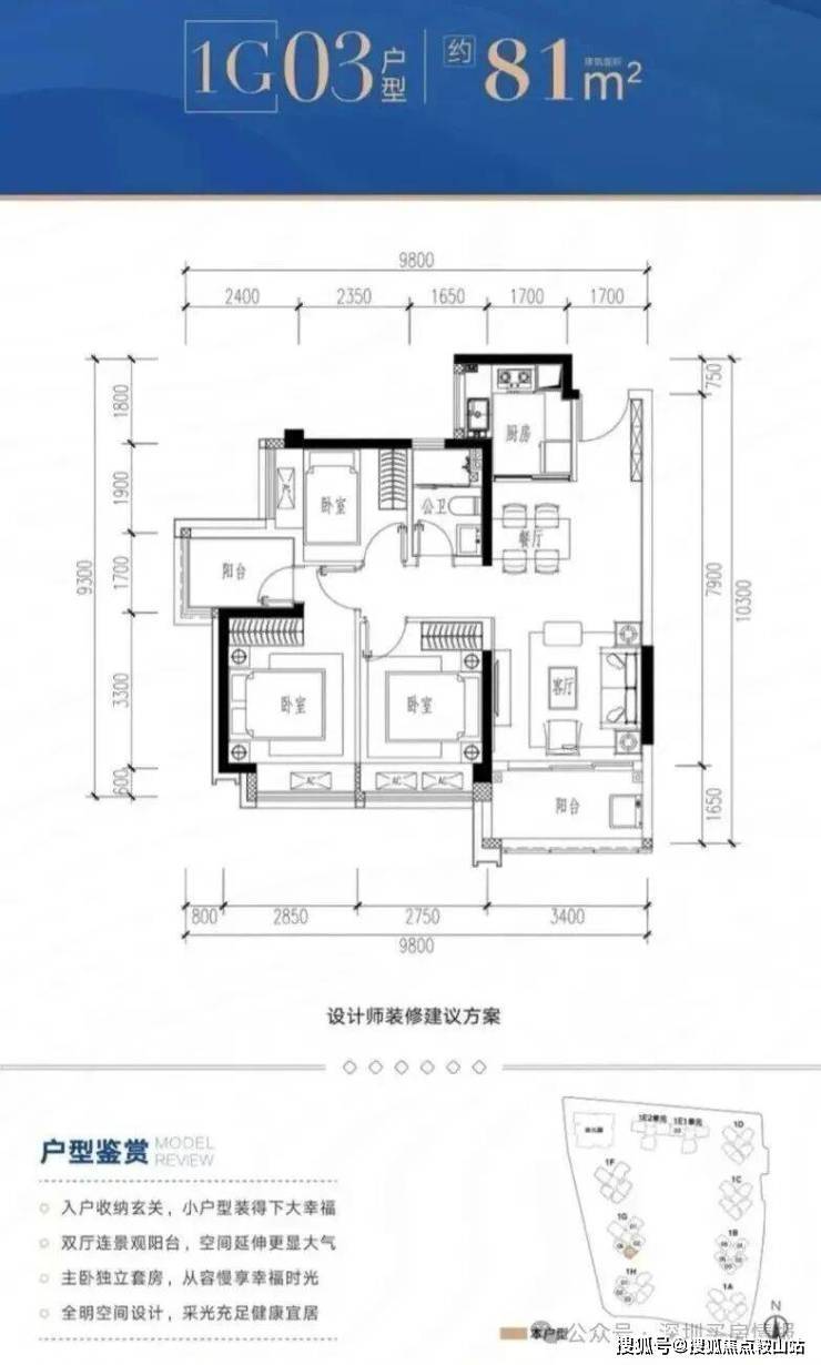 1G-03户型:约81㎡ 三房两厅两卫: