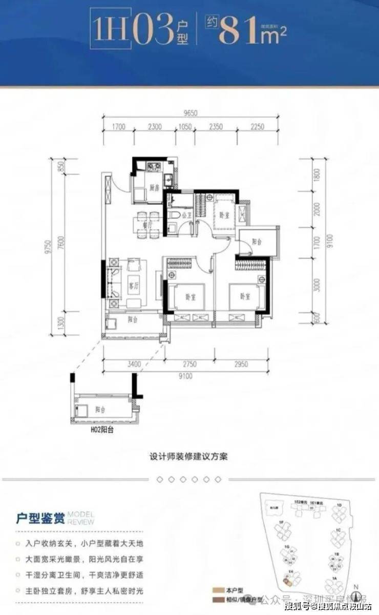 1H-02/03户型:约81㎡ 三房两厅两卫: