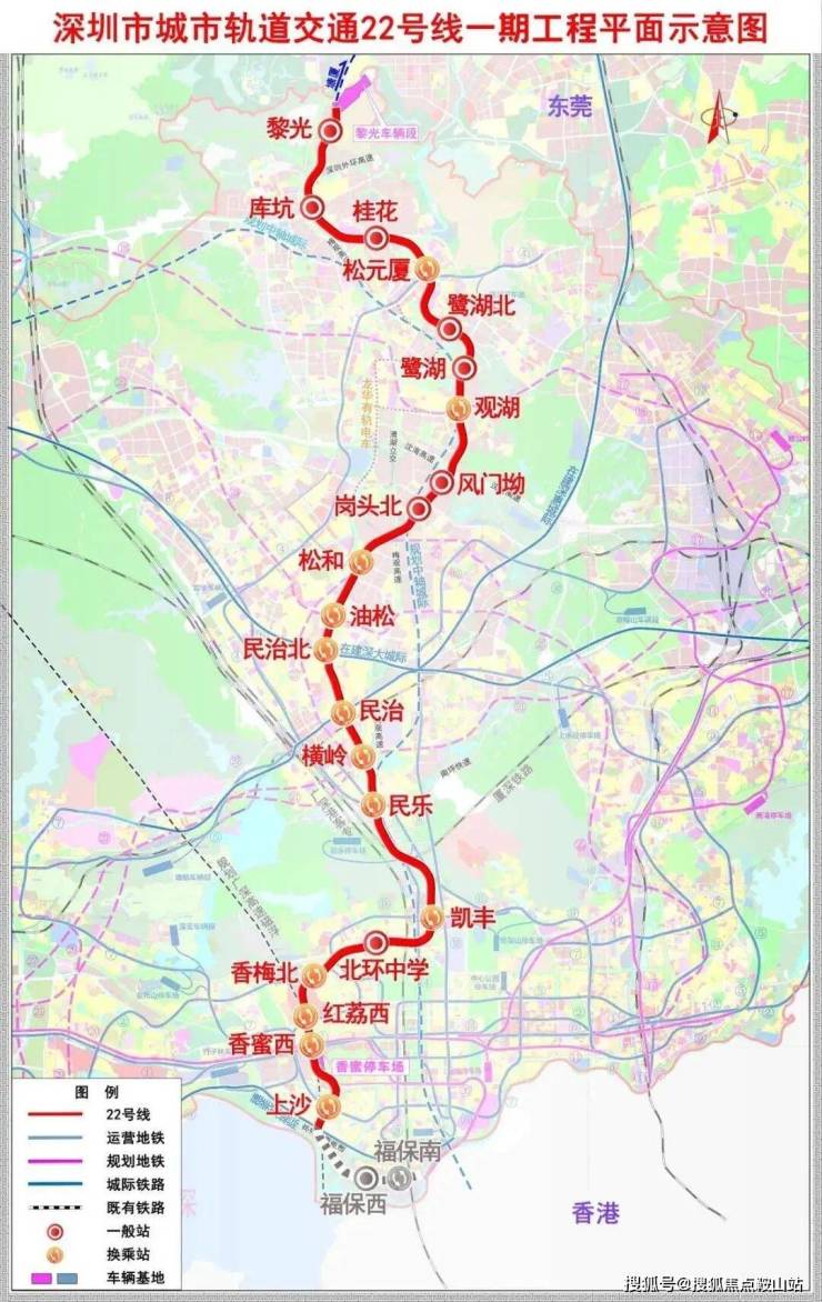 22号地铁线:总投资近400亿元,一期工程在2024年1月份正式开工,起自福田区上沙站,途径龙岗区,止至龙华区黎光站,预留向北延伸至东莞的条件,线路全长34.7公里,总设站21座,设计时速100公里,在未来将实现福田中心区与观澜组团中心45分钟通达的规划目标。
