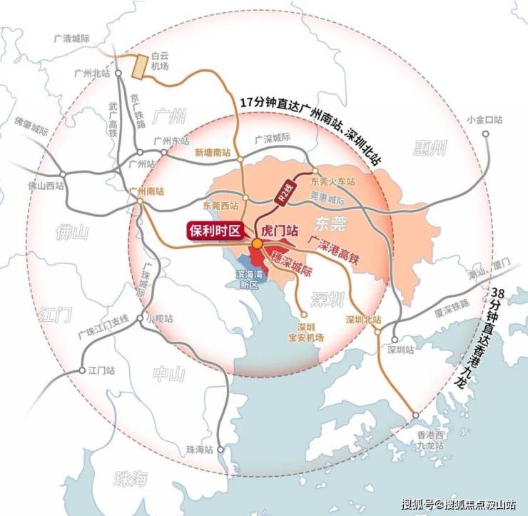 东莞是被两大一线城市(广州、深圳)夹在中间的交通枢纽。从东莞虎门TOD出发,17分钟可到达广州南站、深圳北站,38分钟直达香港西九龙站,约20分钟抵达深圳宝安机场,真正实现1小时湾区生活圈。