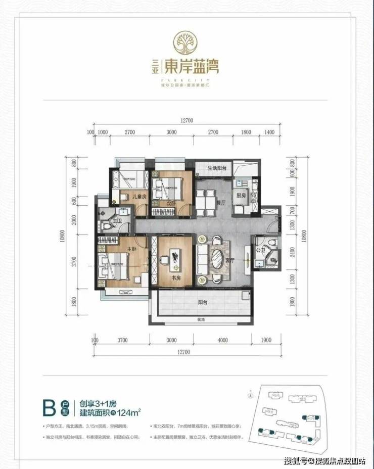 ▼B户型:建面约124㎡创享3+1房
