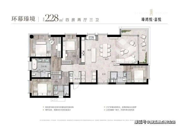 建面约228㎡4房3卫户型,定位高端改善标杆,空间尺度更为阔绰,270°环幕视野堪称亮点,高楼层可将前海湾景、城市天际线尽收眼底。