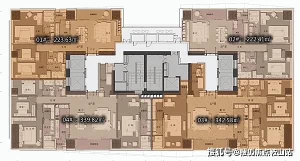 D2户型:约340㎡4房2厅4卫:B栋28-52F(高区),东朝向,户型与343㎡户型基本相同。