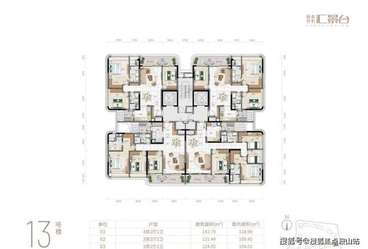 项目由14栋12层小高层组成,产品涵盖123-352㎡三至五房,共8类户型,户型实用率约82-84%