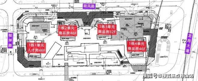 北区:由4栋总高32-46层的住宅组成,总规划837户(其中商品房591户+人才房246户),地下3层,停车位961个(占比1:1.15)。