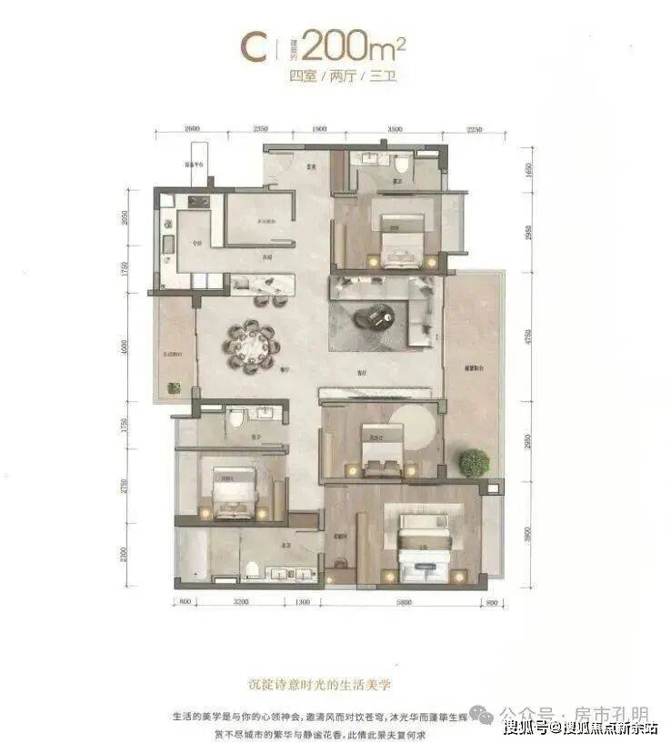 约200平户型为横厅布局,入户处同样带有多功能间,也采取了双套间布局。
