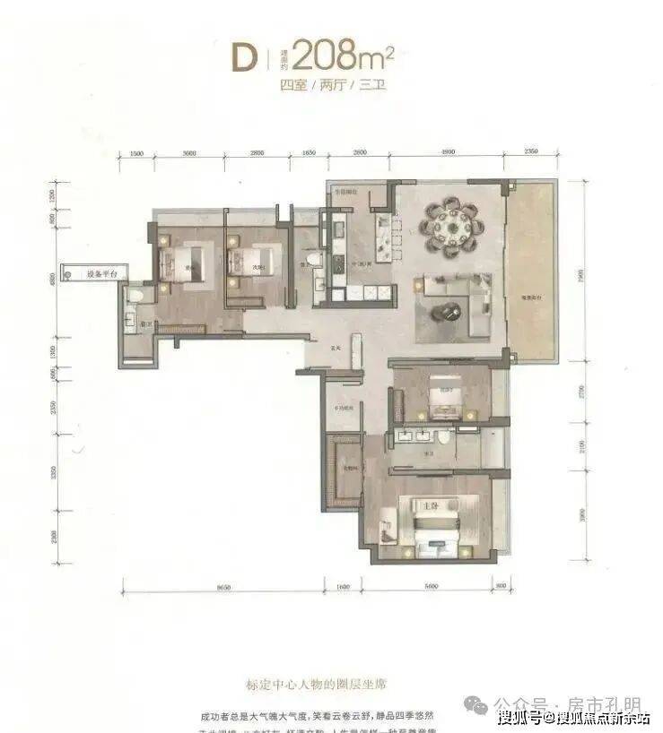 约208平户型是项目内最大的户型,为展翼式布局,卧室围绕起居室两侧垂直分布。