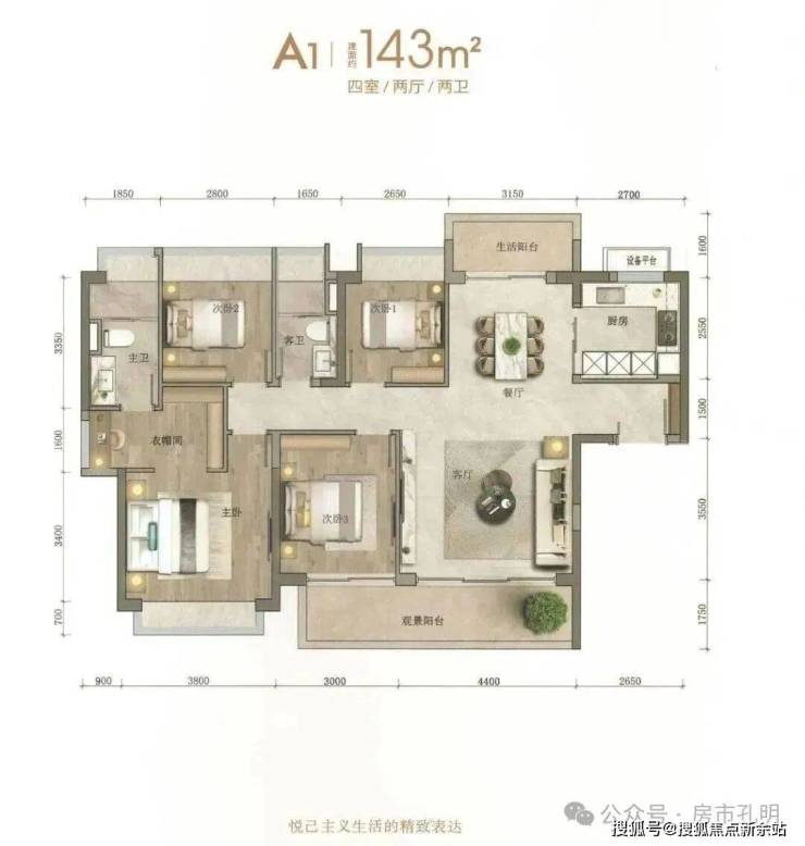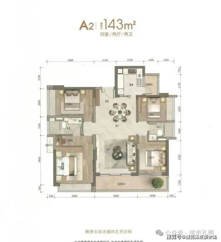 143平A2户型为四叶草竖厅结构,景观阳台跨度更宽,宽约7.1米,跨越客厅及次卧。
