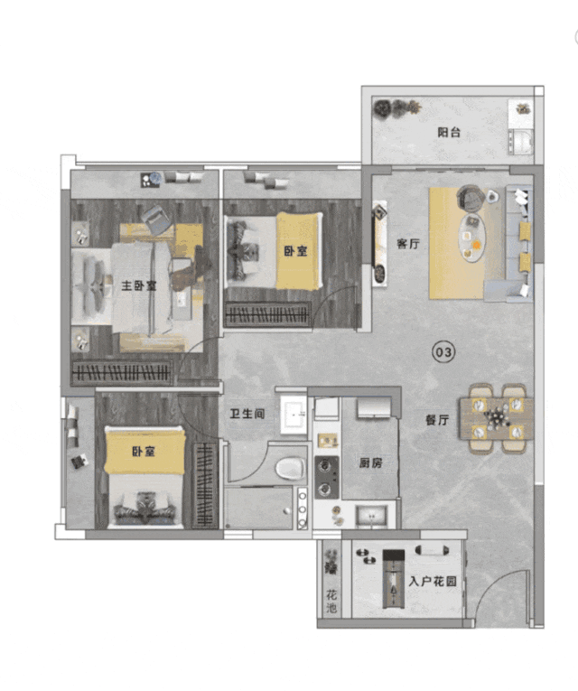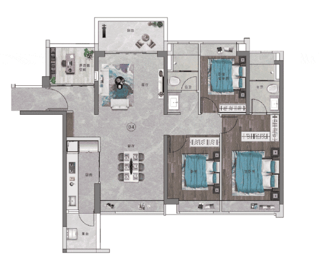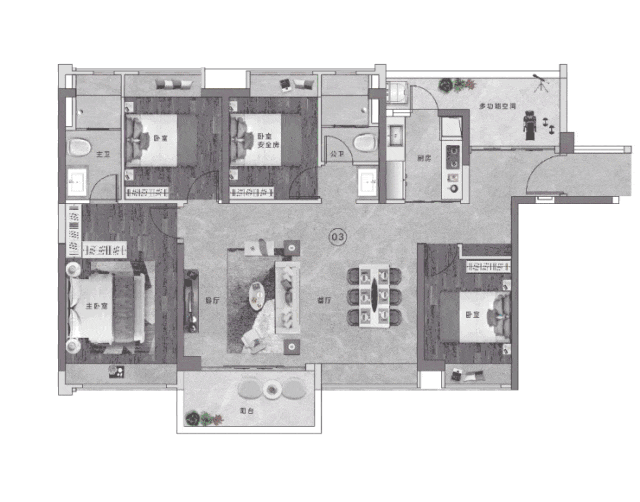 建面约125㎡户型则新增了一个灵动空间,可根据业主生活习惯随意改造成书房、茶室、健身区或萌宠乐园等,让生活增添更多乐趣。