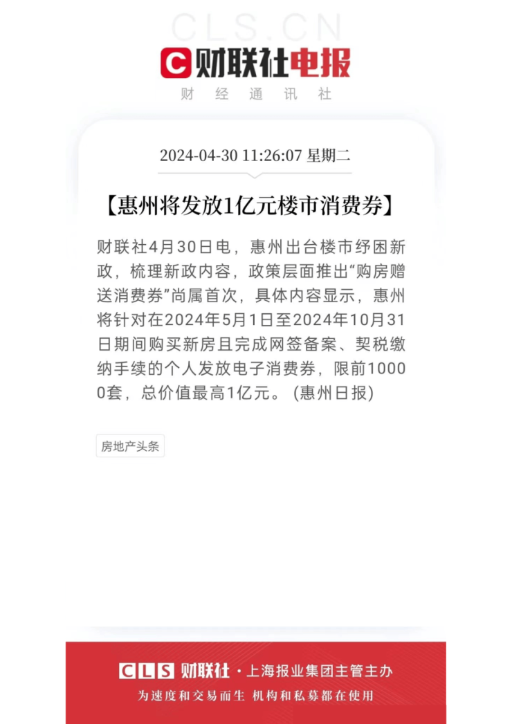 在购房赠送消费券方面,对在2024年5月1日至2024年10月31日期间购买惠州市新建商品住房(不含二手房和非住宅用房),且完成网签备案、契税缴纳手续的个人消费者,发放电子消费券,限前10000套,总价值最高1亿元。购房总价在100万元(不含)以下的,每套发放5000元电子消费券;在100万元(含)以上的,每套发放10000元电子消费券,先到先得,额满即止。