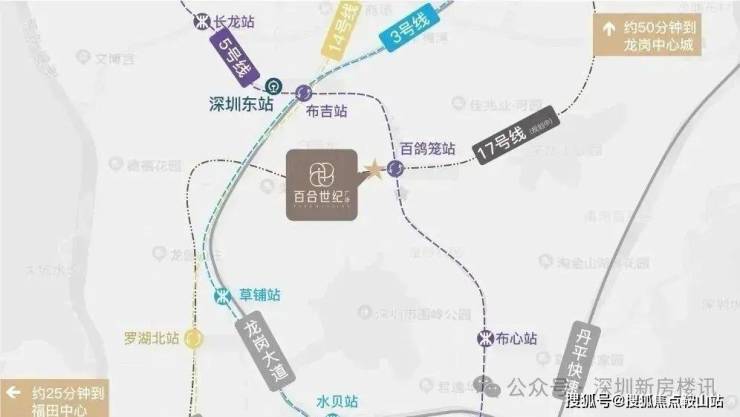 交通配套:百合世纪广场紧邻地铁5号线百鸽笼站(步行约100米),且未来规划有17号线罗岗站约450米在此交汇,形成双地铁上盖优势,通过地铁5号线,1站可换乘3/14号线,4站直达福田核心区,7站快速通达深圳北站,高效串联南山、前海等区域。