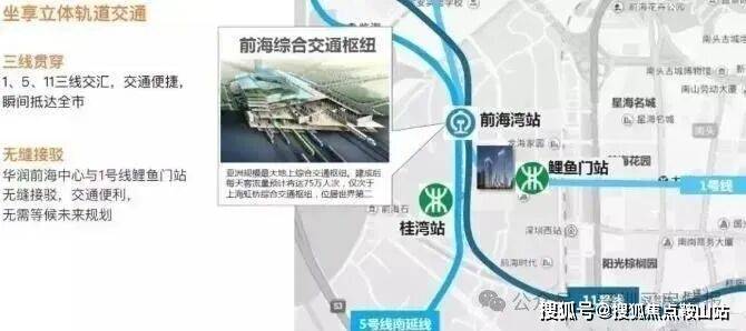前海综合交通枢纽定位为对外交通中心、通勤中心,是穗莞深城际线、港深西部快线、深圳地铁(1、5、11号线)、常规公交线路、出租车及社会车辆等多种交通接驳方式于一体的综合性交通枢纽,并且天健悦桂府东临宝安大道,西临听海大道,前往广深沿江高速通达福田或宝安区都非常方便,整体而言,天健悦桂府的陆路交通条件非常便利。