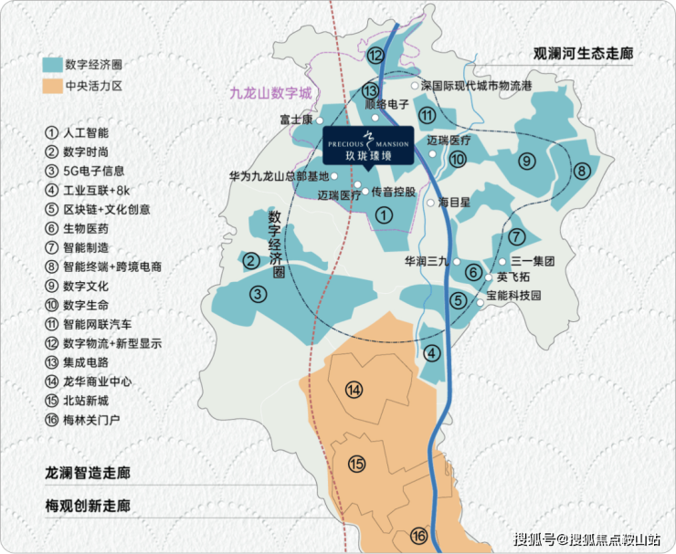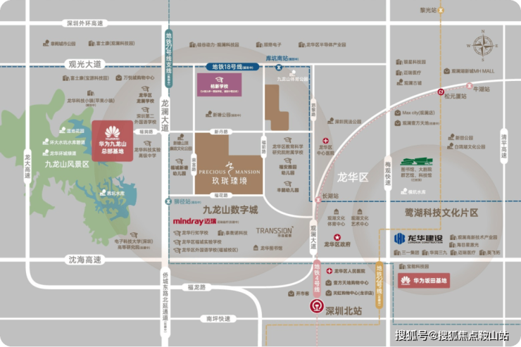 九龙山数字城坐拥龙澜智造与梅观创新产业走廊北部核芯节点,规划约22.77平方公里,超70万㎡华为九龙山总部基地落子于此,2公里内已聚集迈瑞医疗、富士康、传音控股等龙头企业。