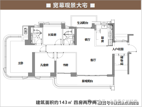 143㎡四房:创新“LDKB”一体化设计(客厅+餐厅+厨房+阳台),阳台进深达2.4米,可改造为茶室或健身区;