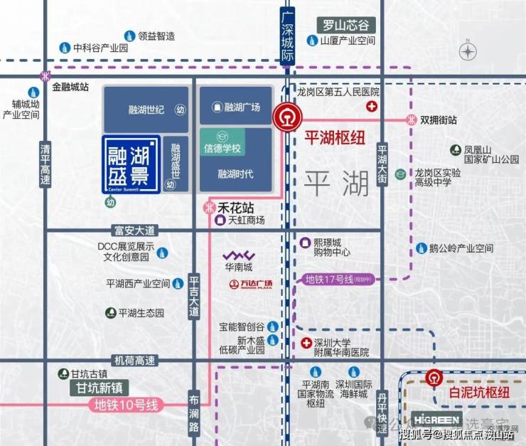 4地铁:项目距离10号线禾花站约500米(百度测距),连接坂田,直达福田中心区;另有规划中地铁17号线(直连罗湖口岸)/18号线(连通空港新城)/21号线(向西联系南山高新区、前海自贸区等高新区),通勤更高效;