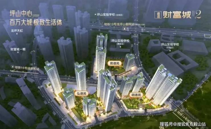 偏?坐地铁到福田只要45分钟,比龙华还快!”,财富城家门口三地铁环绕:14/16/19号线(在建),坪山广场站、新和站、坪山剧院站(在建)三站环绕,快线6站到大运、13站直达岗厦北,便捷换乘畅达各区核心;