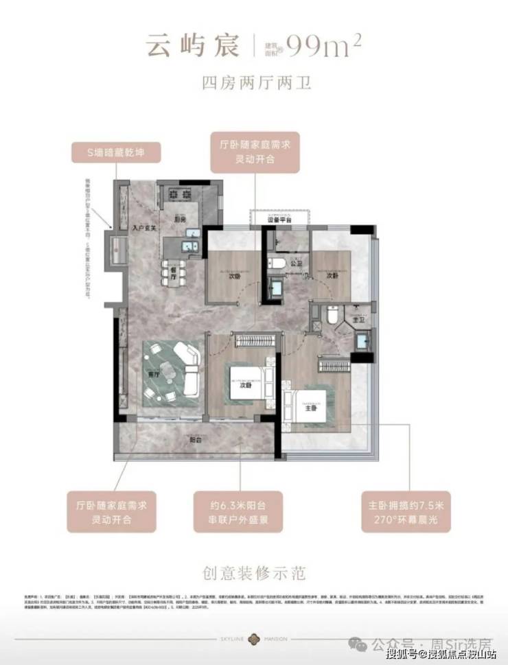 99㎡的4房2厅2卫,设计的是竖厅格局,客厅3.35米开间,LDKB一体化,S墙设计预留双开门冰箱卡槽位,三开间朝南,动静分区,U型厨房,公卫三段式干湿分离,赠送设备平台,得房率约78.27%(不含赠送),客厅连接次卧出9.37m²大阳台西南或东南朝向。靓点:99平做到了4房2卫,主卧270°无柱转角飘窗,厨房烟道外置+额外赠送设备平台,并且是纯南向格局。