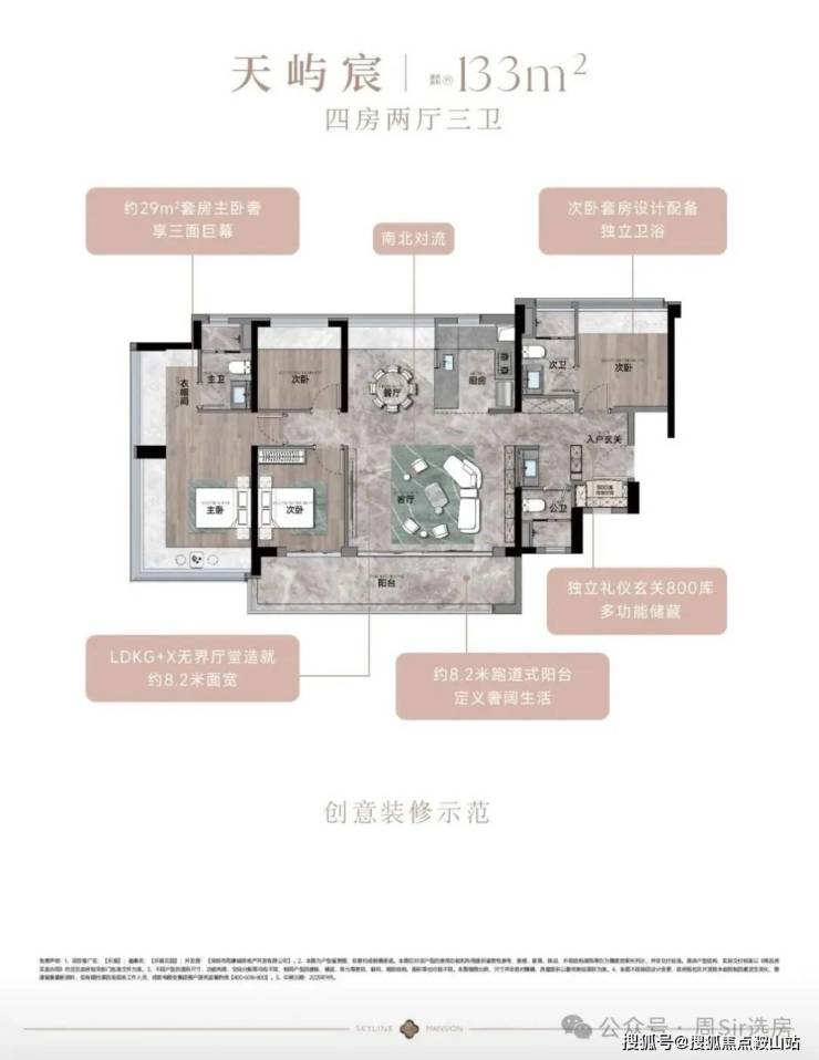 133㎡的4房2厅2卫,设计的是竖厅南北通透格局,进门入户玄关,客厅5.4米开间,餐客厅分离设计,客厅连接次卧出12.3m²的观景大阳台,L型中式+岛台灵动式厨房,公卫三段式干湿分离,得房率约78.27%(不含赠送),阳台主朝东南或西南向。靓点:超大客餐厅南北对流+8.2米长超大观景南向阳台,超大主卧+270°无柱转角飘窗。