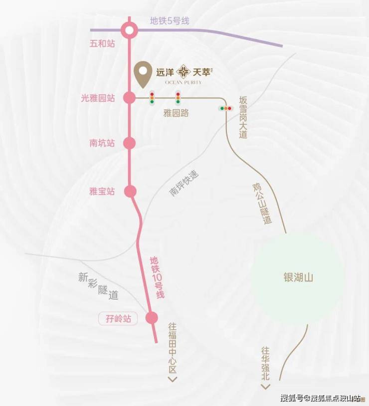 远洋天萃家门口就是“福田专线”——10号地铁线“光雅园站”B出口,1站到五和枢纽站,可换乘5号地铁线/深大城际,3站可到龙华深圳北站,3站到福田、4站到南山。