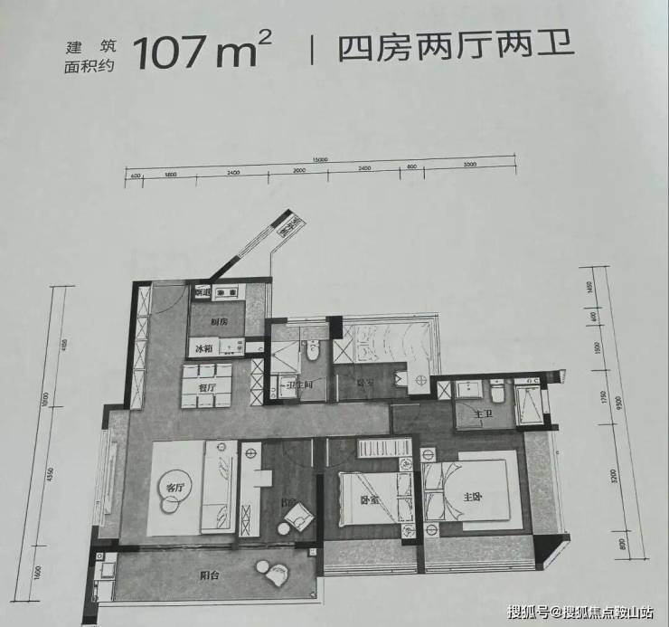 110㎡的4房2厅2卫,设计的是横厅南北通透格局,进门入户玄关,客餐厅6米开间,LDKB一体化,4个卧室分别做到了4.1米/3米/2.5米/2.4米的宽度,主卧套房设计,客厅连接次卧出6.7米长的大阳台,L型厨房,卫生间干湿分离,阳台主朝西南向。