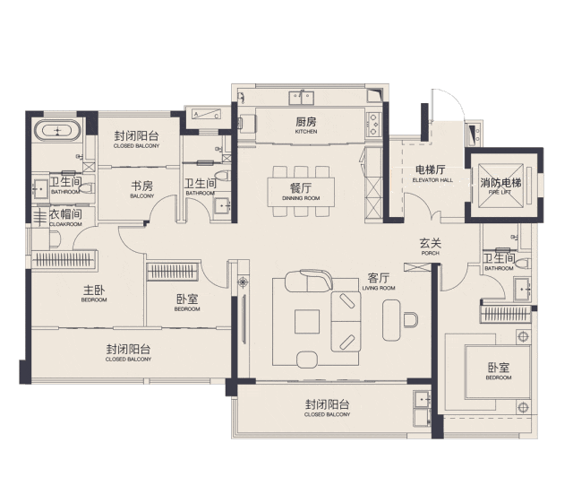 (4)大师设计:私梯入户提升归家仪式感,双套房设计实现家庭动静分离,主卧套房配备大女主衣帽间,细节处处体现高端人居理念。