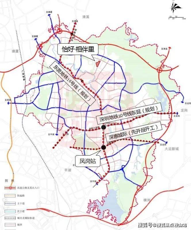 怡好·相伴里与深惠城际的凤岗站及深圳地铁10号线东延的规划站点都有一定的距离,但按照东莞市轨道交通网络规划(2035),将来在项目附近有东莞地铁16号线、深圳地铁31号线的站点布局,形成有效的路网结构。