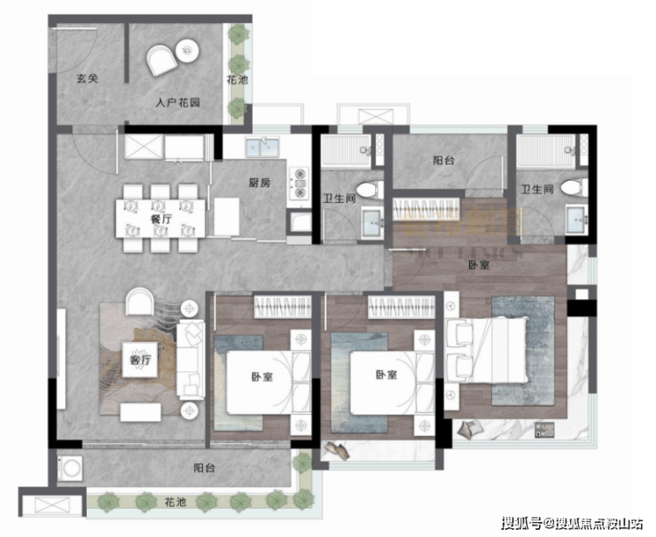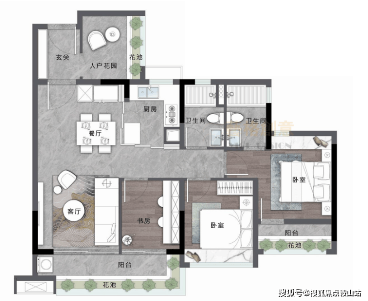 功能性下沉地下室:在后勤路线专设快递/垃圾处理空间,提供舒适、健康的居所环境。