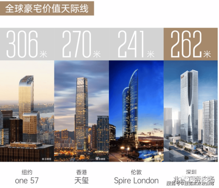 兆鑫汇金广场,深南大道封面地标,以其262米的超人之姿比肩全球顶级豪宅。世界顶级豪宅同样存在着一条价值天际线——纽约的one 57、香港的天玺、伦敦的Spire London,包括深圳的深圳湾壹号,作为各自区域的最高居所,矗立于当地人居的价值之巅。