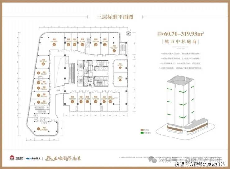 项目1-4层为凝聚时尚购物、餐饮娱乐于一体的城市综合性商业广场,产品面积段覆盖42-320㎡的城市中芯底商,首层层高高达六米,未来将成为三亚商业消费的新核,为城市精英提供全面多彩的都会商住生活。