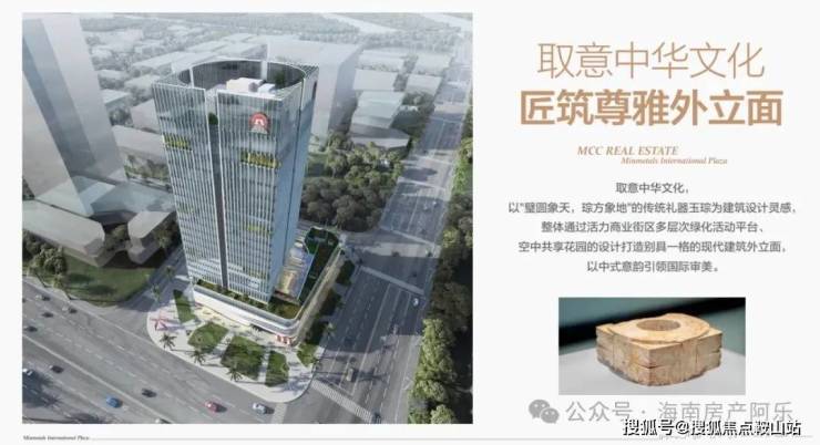 国匠中冶,首著三亚。以“璧圆象天,琮方象地”的传统礼器——玉琮为建筑设计灵感,通过多层次绿化活动平台、空中共享花园等高端设计,打造集科技研发、智慧办公、绿色商街为一体的国际5A甲级写字楼。